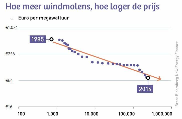 Elke keer dat de productiecapaciteit voor windmolens verdubbelt, daalt de prijs van de molens met ongeveer 19 procent, Als we hier de groei van de afgelopen tien jaar doortrekken zitten we in 2030 op drie verdubbelingen van het jaarlijkse productievolume. Dat zou bijna een halvering van de prijs betekenen.