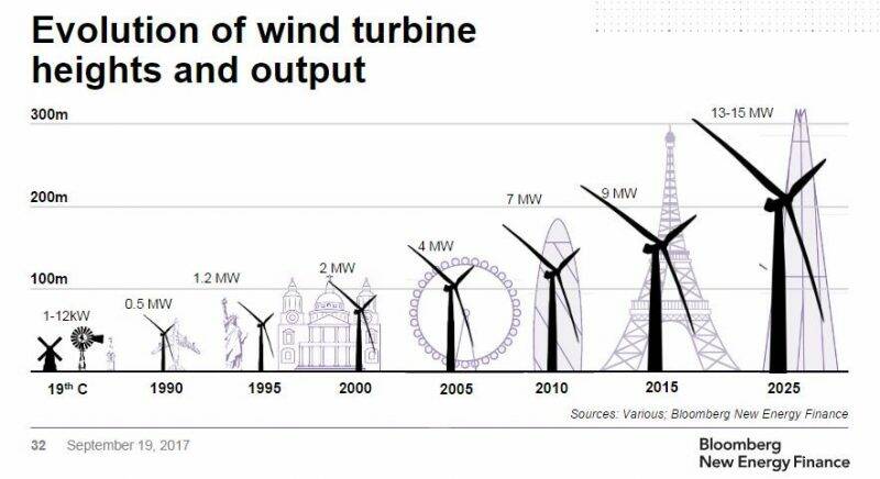 De technische ontwikkeling heeft geleid tot steeds grotere windmolens. Daar waar aanvankelijk windmolens op land werden geïnstalleerd heeft installatie op zee een grote vlucht genomen.