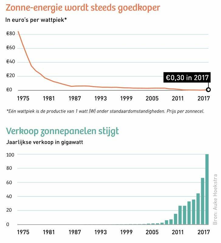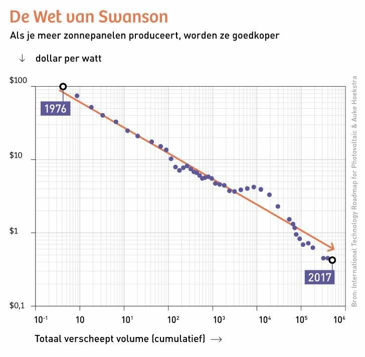 Net zoals er een wet Moore bestaat voor computer chips, bestaat de wet van Swanson voor zonnecellen. Deze laat zien dat de prijs daalt naar mate er meer volume is geproduceerd; bij elke verdubbeling van het totale verscheepte volume daalt de prijs van zonnepanelen met 20 procent. Merk ook op dat de totale geinstalleerde capaciteit in de periode 1990 tot 2017 exponentieel is gestegen [5], waardoor we in rap tempo de curve van Swanson doorlopen. Alles wijst erop dat deze exponentiële groei zal doorzetten.